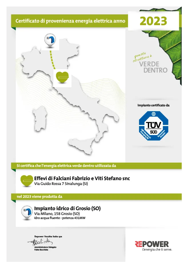 Tale impegno è garantito dal Certificato TUV SUD – emesso dall’Ente indipendente di certificazione – che attesta l’origine verde dell’energia fornita e la sua rintracciabilità, assicurando che tutta l’energia consumata da EFFEVI proviene da fonti 100% rinnovabili, come vento, acqua, e sole.